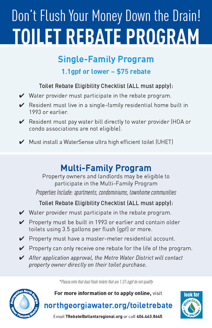 If your single-family home was built before 1993, you can apply for the Single Family Toilet Rebate Program administered by the Metropolitan North Georgia Planning District. You may be eligible to receive a $75 rebate on qualifying WaterSense labeled ultra high efficiency toilets to replace older toilets in your home.