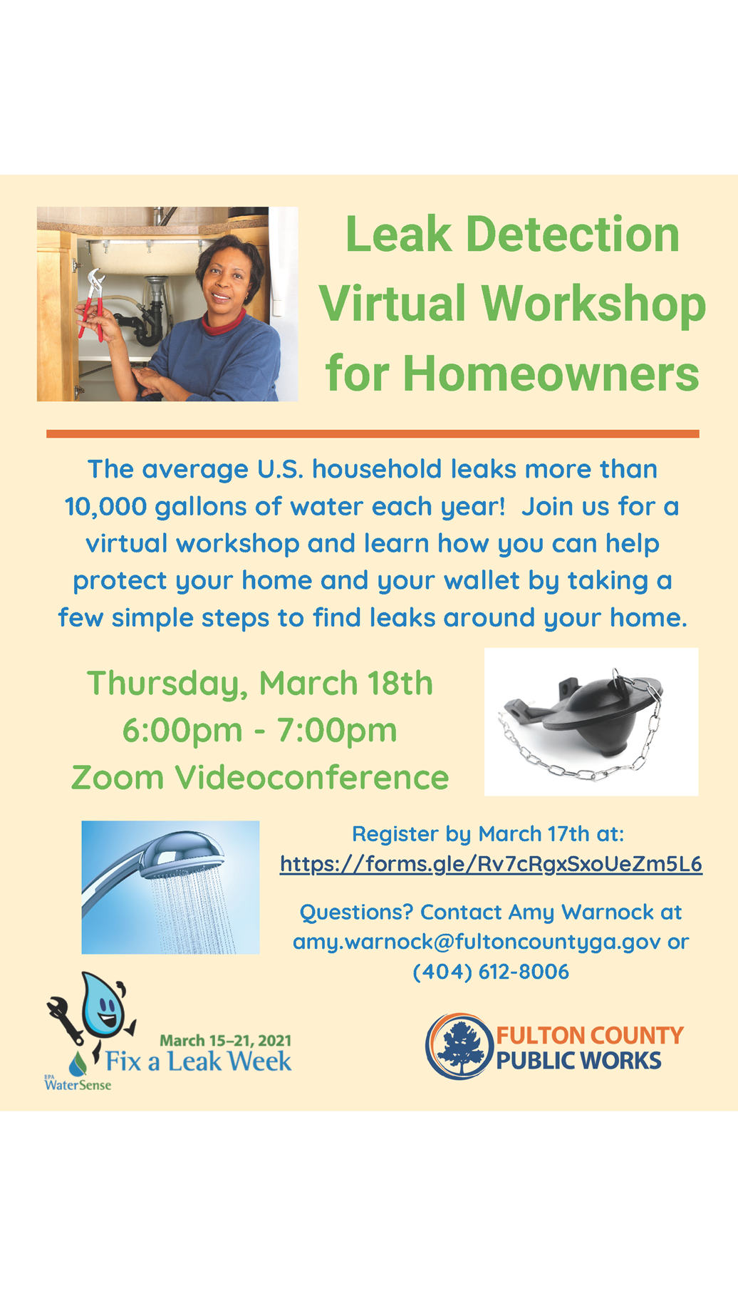 The Fulton County Public Works Department will hold a virtual workshop to help homeowners find and repair leaks in their homes. The workshop is part of the department’s recognition of “Fix-A-Leak” Week, which is March 15 – 21, 2021.