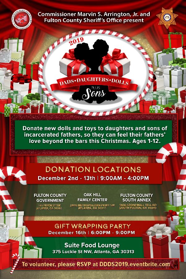 As part of the effort to reach out to families in need this holiday season, Fulton County District 5 Commissioner Marvin S. Arrington, Jr., in partnership with the Fulton County Sheriff’s Office, is inviting residents to support the annual Dads, Daughters, and Dolls Plus Sons drive. This is an effort to collect new dolls and other toys for children of men incarcerated in the Fulton County Jail. Children will receive handwritten letters from their fathers in addition to the gifts provided by donors.