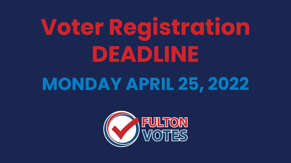 Monday, April 25, 2022 is the deadline to register to vote during the Advance Voting period, online, or in-person for the May 24, 2022 General Primary. It is not too late for Fulton County residents to submit their voter registration.