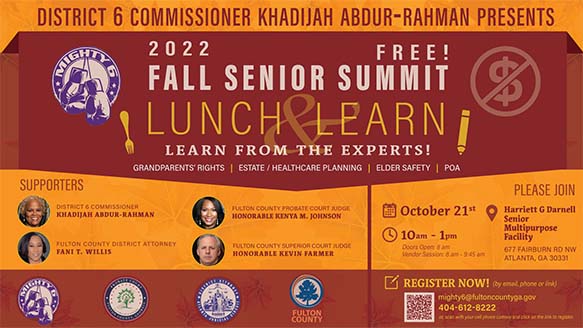 The summit, a second in a series, is hosted by Fulton County Mighty6 District Commissioner Khadijah Abdur-Rahman and will feature District Attorney Fani Willis, Superior Court Judge Kevin Farmer and Probate Judge Kenya Johnson to provide solutions and answers to seniors’ questions and concerns.
