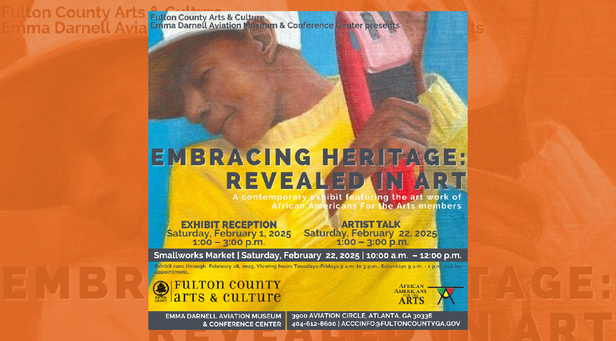 The Fulton County Department of Arts & Culture is excited to announce the upcoming exhibition, "Embracing Our Heritage: Revealed in Art," which will showcase contemporary works by artists of the collective African Americans for the Arts. The exhibition is set to open on February 1, 2025, and will run through February 28, 2025, at the Emma Darnell Aviation Museum and Conference Center, 3900 Aviation Circle, NW, Atlanta, GA 30336.